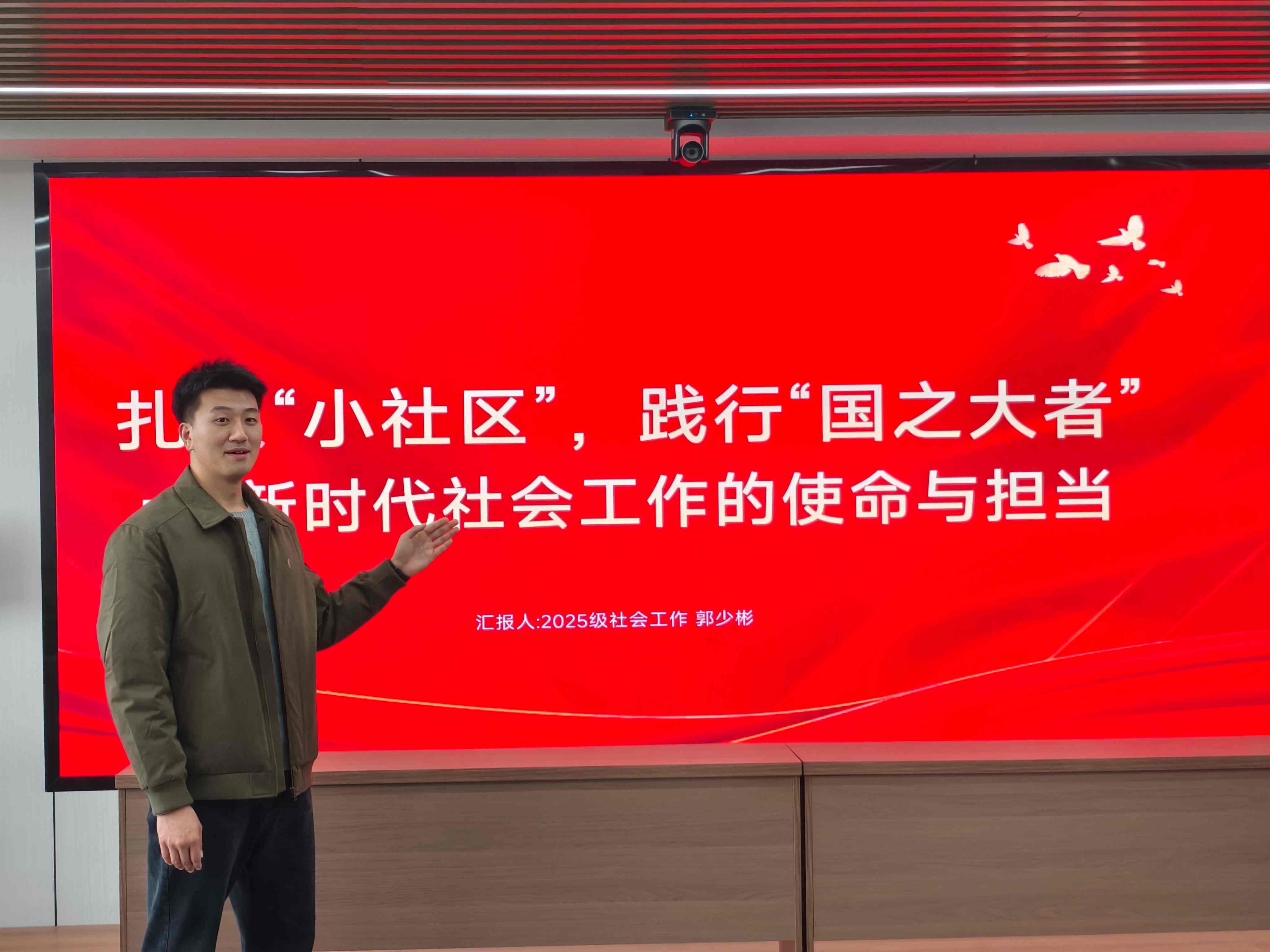 宣讲人郭少彬结合专业学习和实践思考,和同学们深入探讨了社会工作服务基层治理的实践方法。从“个案工作”实现对困境群体的“精准化”帮扶,“小组工作”为“一老一小”等群体构建“支持性”网络,“社区工作”推动“精细化”治理等方面,提出可操作性的个性化解决方案。在交流环节,同学们踊跃发言,就新时代社工学子如何脚踏实地担当使命展开热烈讨论,凝聚共识。