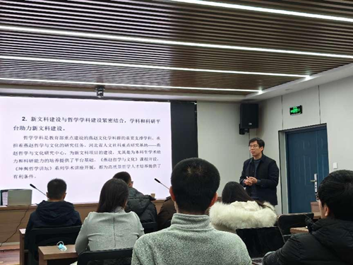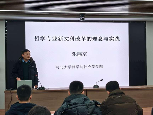 在主题报告中,张燕京教授以哲学专业新文科建设的成功经验为例,从新文科建设改革的理念、举措、典型案例,总结概括了新文科改革的特色,并提出了哲学专业和学院新文科建设工作的下一步设想。他指出建成国家级一流本科专业的重要抓手就是新文科建设,并以《人工智能哲学》和《燕赵哲学与文化》两门课为典型案例阐述了如何推动哲学专业与其他多学科的深度交叉融合的课程改革创新具体经验。在制度创新层面,张燕京教授特别强调了学院通过创设“导师制”和“书院制”推动新文科建设改革的举措。林顺利教授以“坤舆群学书院”为例对学院整体推进的“书院制”工作进行了经验分享。沙龙的最后,张燕京教授再次强调了课堂教学对于青年教师“安身立命”的重要性,并以自身经历鼓励大家积极投入立德树人工作中。