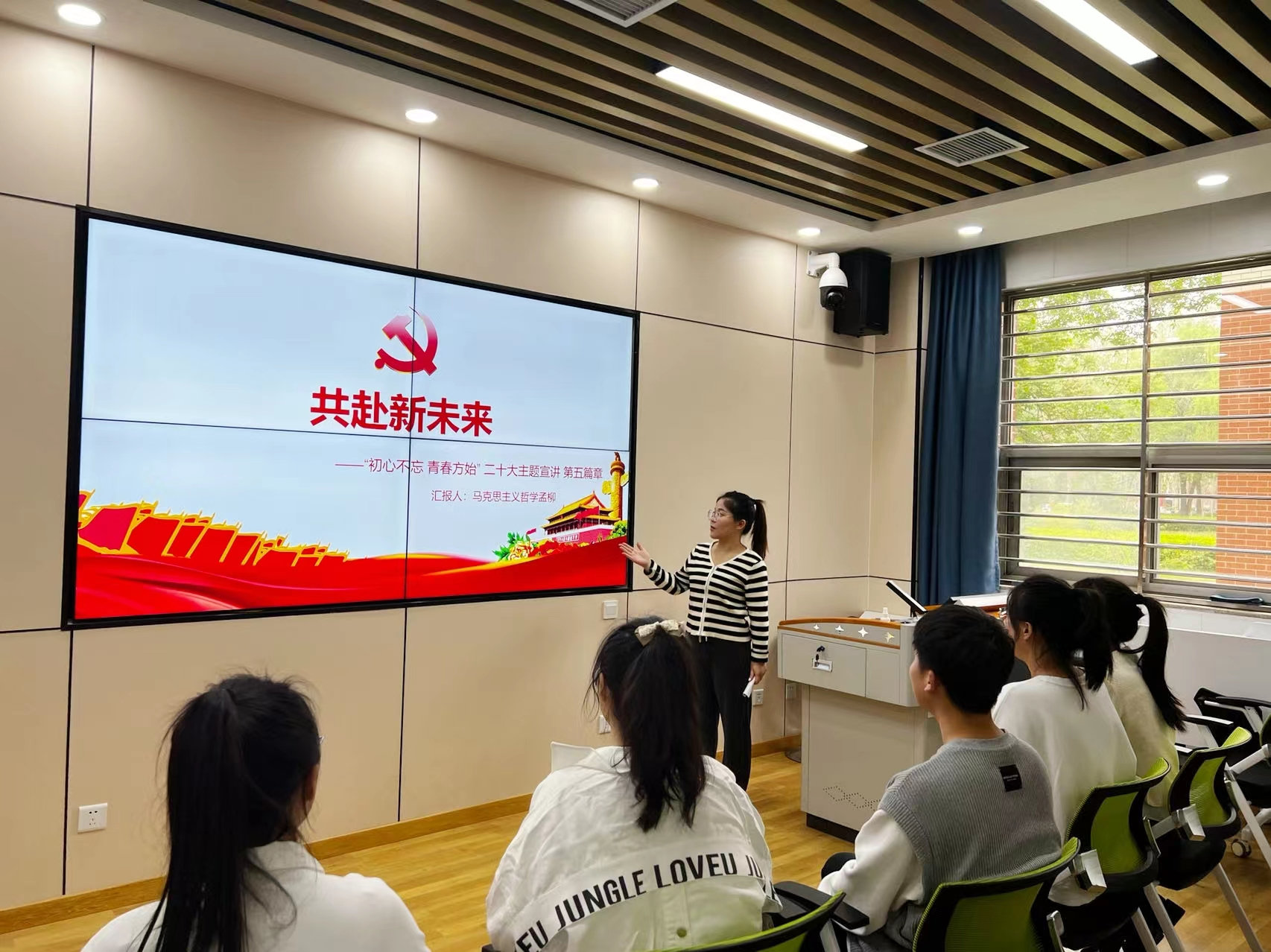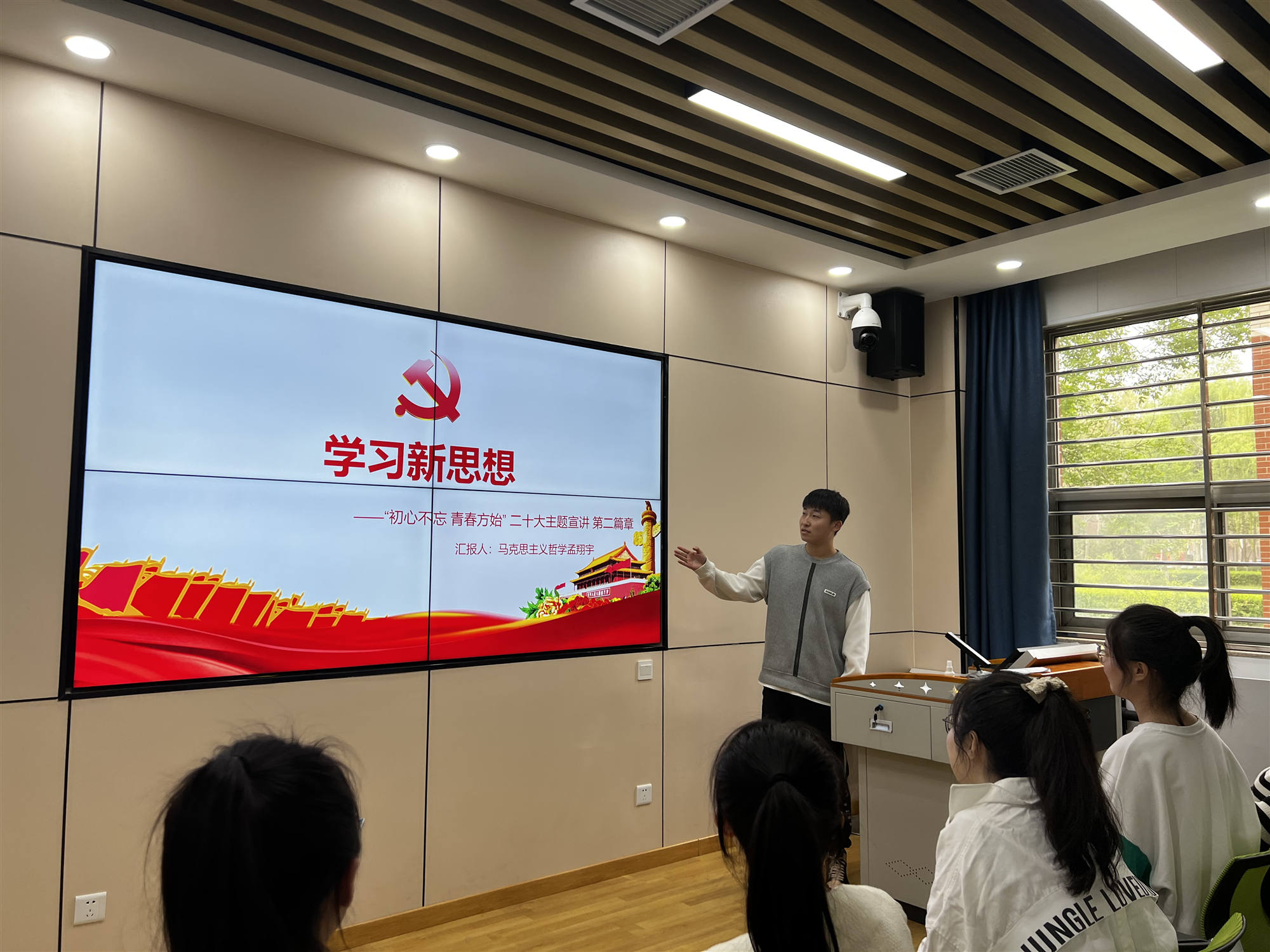 哲学与社会学院在B4-112专业实验室召开 “不忘初心 青春方始”为主题的党的二十大精神宣讲会。此次宣讲会由学院马克思主义哲学专业研究生团队六名同学担任主讲,学院党委书记张露红、师生代表50余人参加了本次活动。