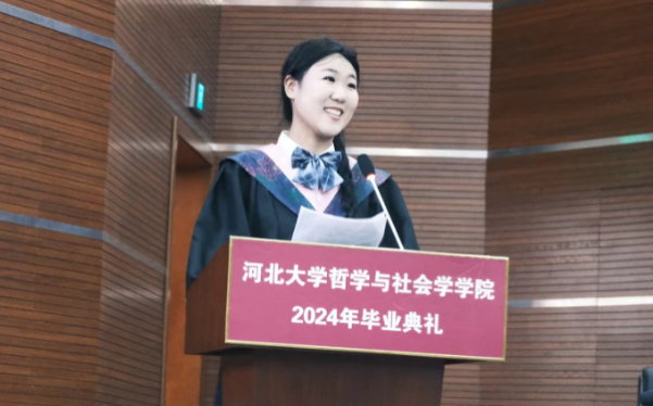 难忘大学时光,驻留真美芳华。本科生代表,学思奖学金一等奖获得者杜嘉璐分享了河大故事与成长点滴,表示要继续传承“求智慧之学,行至善之事”的扎实作风,奋力书写为中国式现代化挺膺担当的青春篇章。