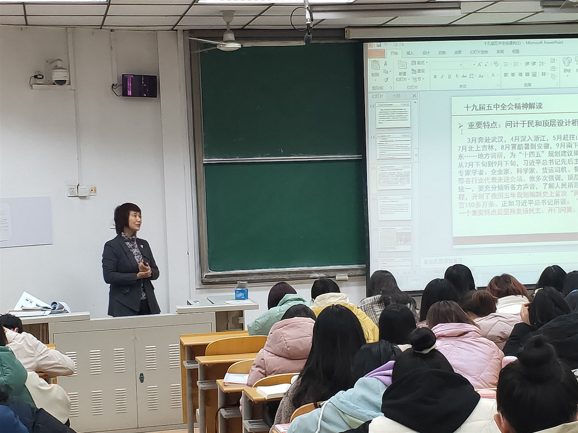 12月1日,尼克成人网 党委书记张露红为学院2019级全体学生开展了十九届五中全会精神宣讲。150余名学生参加了学习。