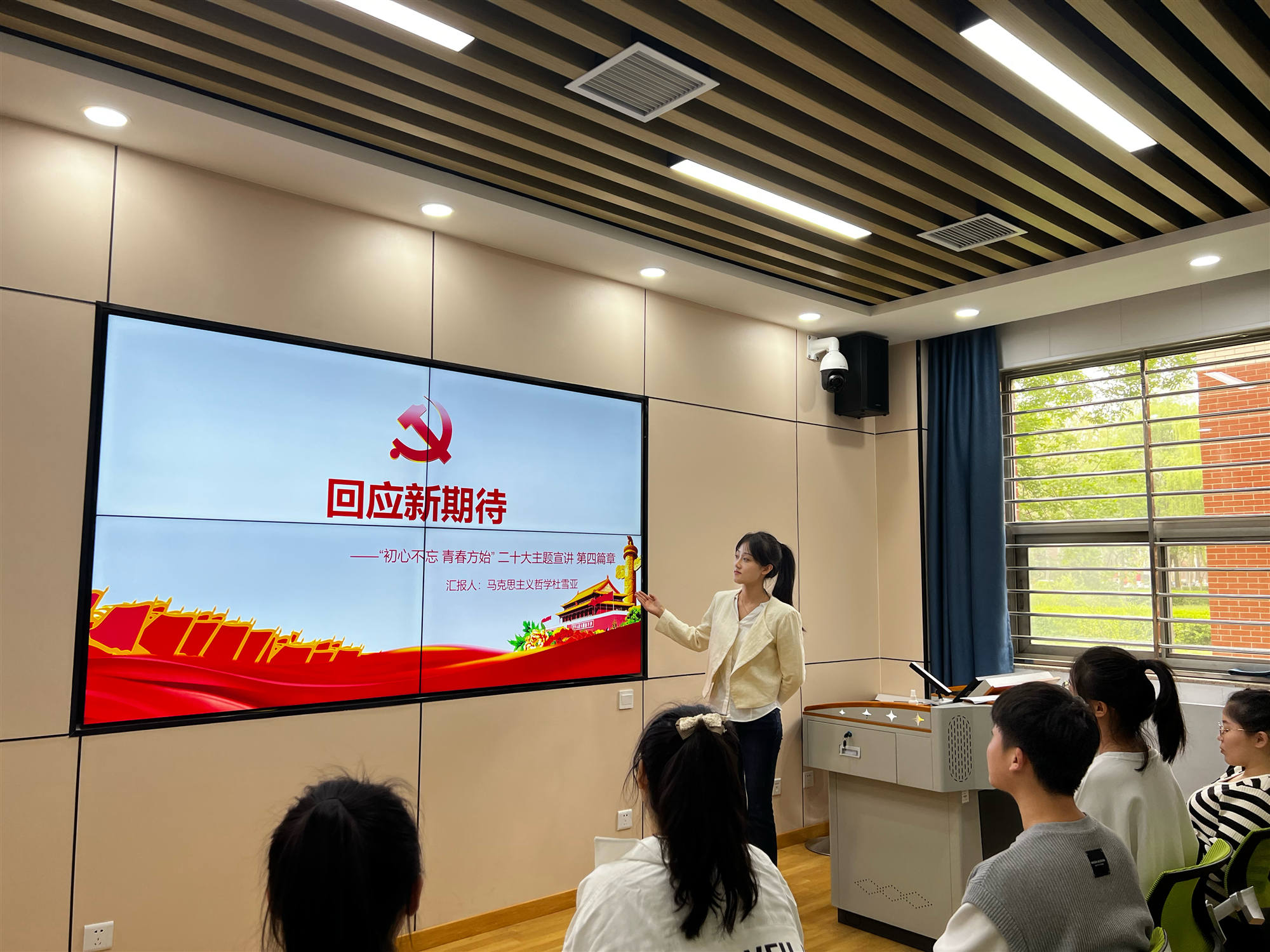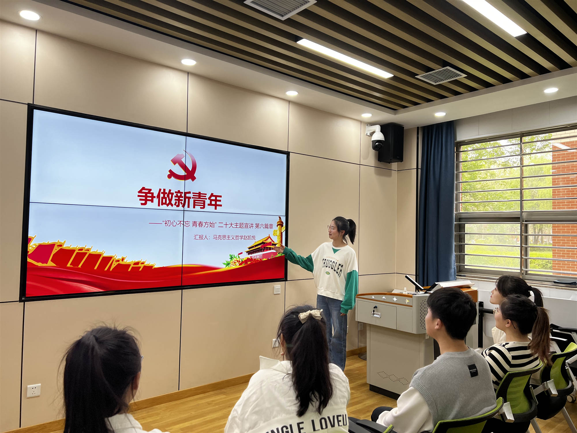 为深入学习贯彻二十大精神,4月16日下午,学院团委在B4-112专业实验室召开 “不忘初心 青春方始”为主题的二十大精神宣讲会。此次宣讲会由学院马克思主义哲学专业研究生团队六名同学担任主讲,学院党委书记张露红、团委书记王昭、辅导员尹清华,及学生代表50余人参加了本次活动。