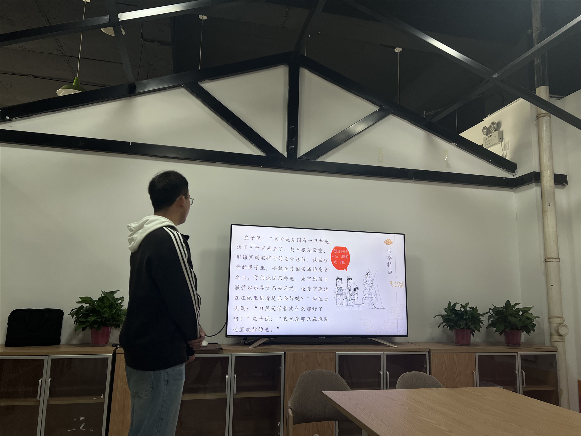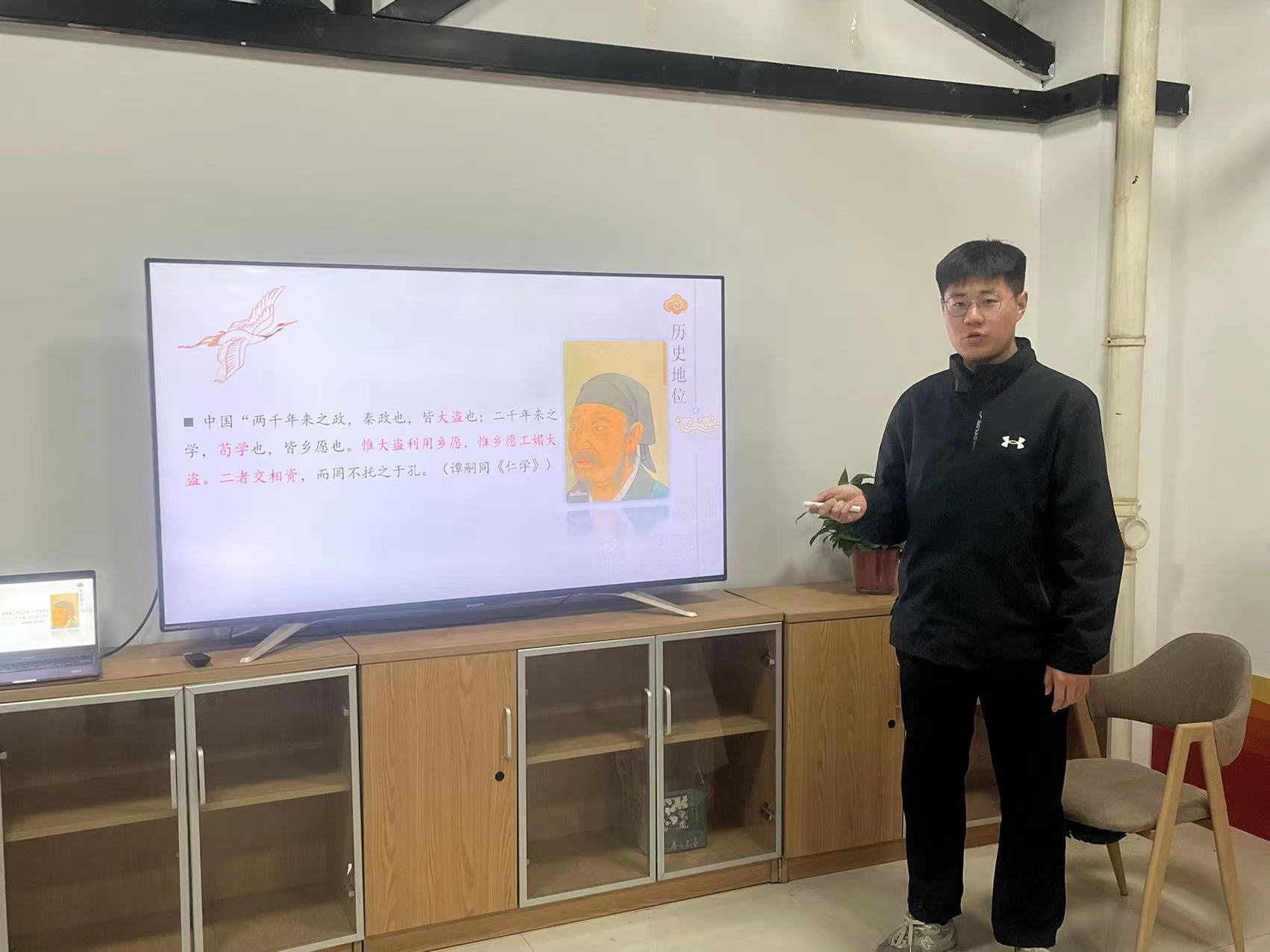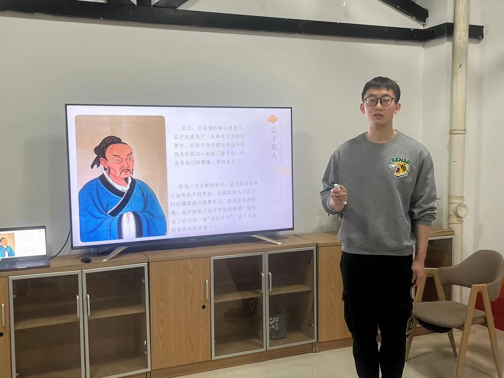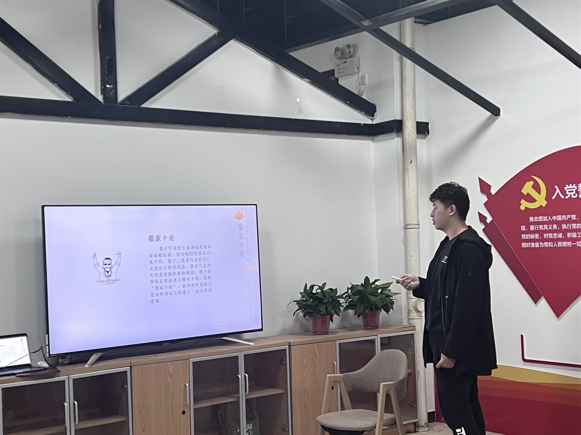 张泽宇同学宣讲墨子,用“墨守成规”的小故事引入,介绍了墨子的生平、主要思想、墨家的衰落与历史影响。