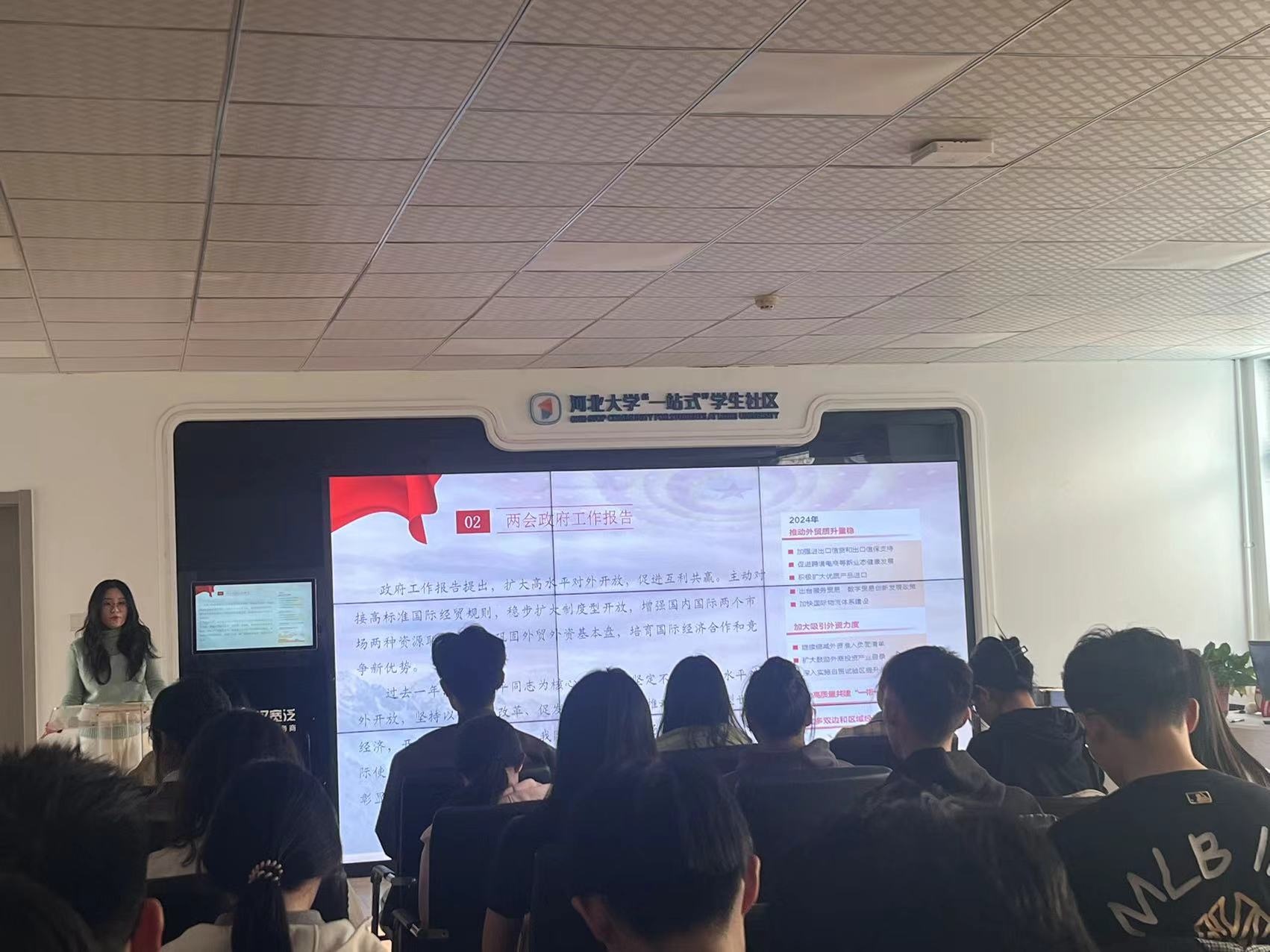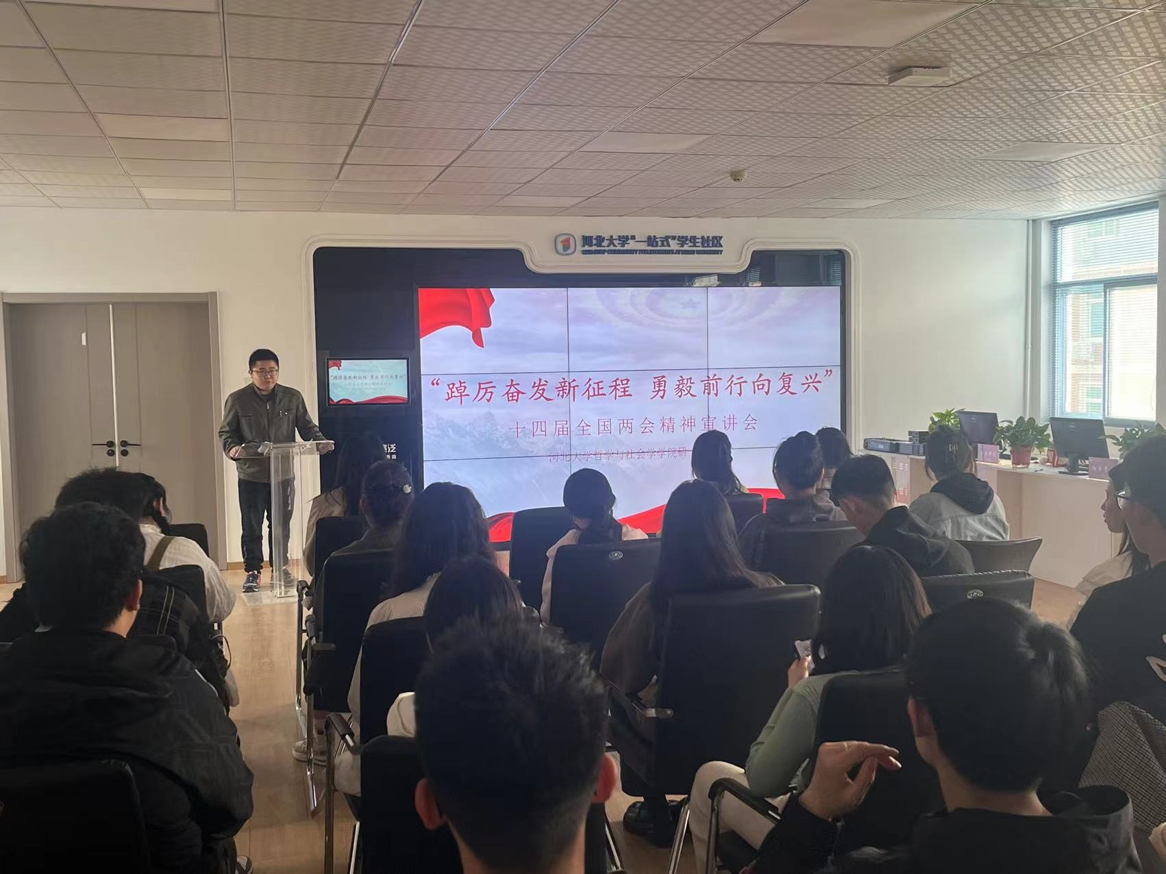 2024年4月11日,哲学与社会学院研究生第一党支部在新校区一站式服务中心开展“踔厉奋发新征程 勇毅前行向复兴”第十四届全国两会精神宣讲会。学院党委副书记王昭,宣讲团成员,师生代表50余人参加了本次活动。