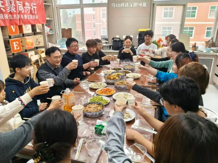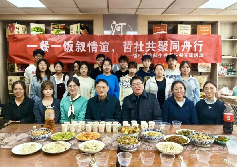 在七一路校区“河当家”共享厨房成功举办“一餐一饭叙情谊,哲社共聚同舟行”师生共享午餐交流活动。学院院长张燕京,党委副书记王昭,专职辅导员尹清华、张惠娟及学生代表一起以食为媒,共赴一场充满烟火气的暖心之约。